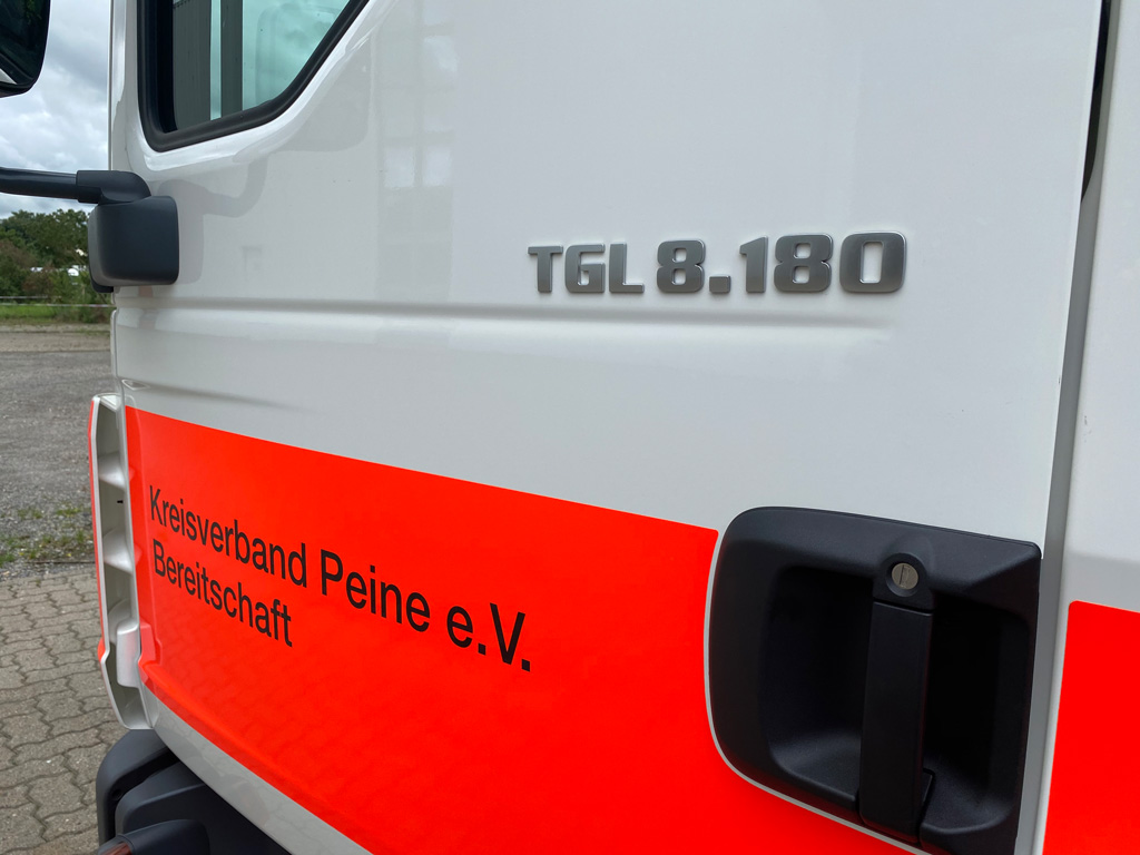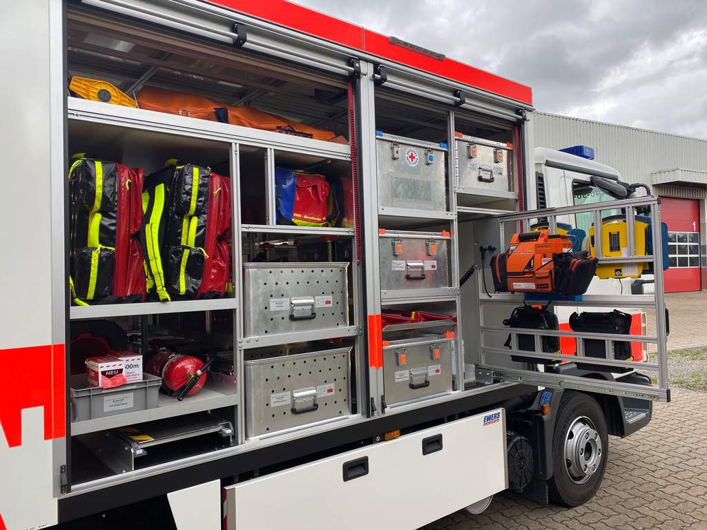 Das Fahrzeug ist mit einer Ladebordwand ausgestattet, um ein einfaches Absetzen der Rollcontainer zu ermöglichen. Die drei Rollcontainer sind mit schwerem technischem Material beladen. Die Zeltheizung sowie das Stromaggregat kann auf dem Rollcontainer betrieben werden und muss somit nicht abgelastet werden. Das Fahrzeug besitzt einen Spannungswandler zum dauerhaften Laden der Rettungsmaterialien.