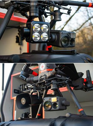 Als zusätzliche Nutzlast können wir zwischen einem LED-Scheinwerfer mit 10200 lm und einer Leuchtweite von mehr als 100 Meter oder einem Lautsprecher mit einer Lautstärke von bis zu 130db und eine Übertragungsweite von bis zu 500m wählen. Durch diese beiden Nutzlasten erweitern sich die Einsatzmöglichkeiten der Drohne ungemein. Mittels des Scheinwerfer können Bereiche einer Einsatzstelle aus der Luft ausgeleuchtet werden oder nachts hochauflösende Fotos machen.